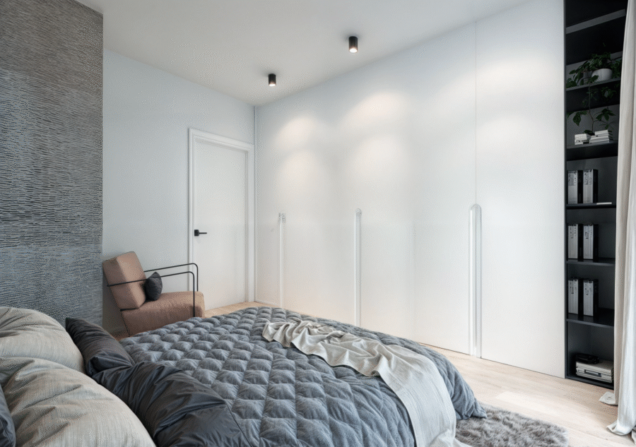 Charakterystycznym i praktycznym elementem aranżacji wnętrza są szafy w zabudowie, występujące w holu oraz obu sypialniach. Drzwi do jednej z sypialni to tzw. drzwi ukryte, są spójne kolorystycznie ze ścianą.
