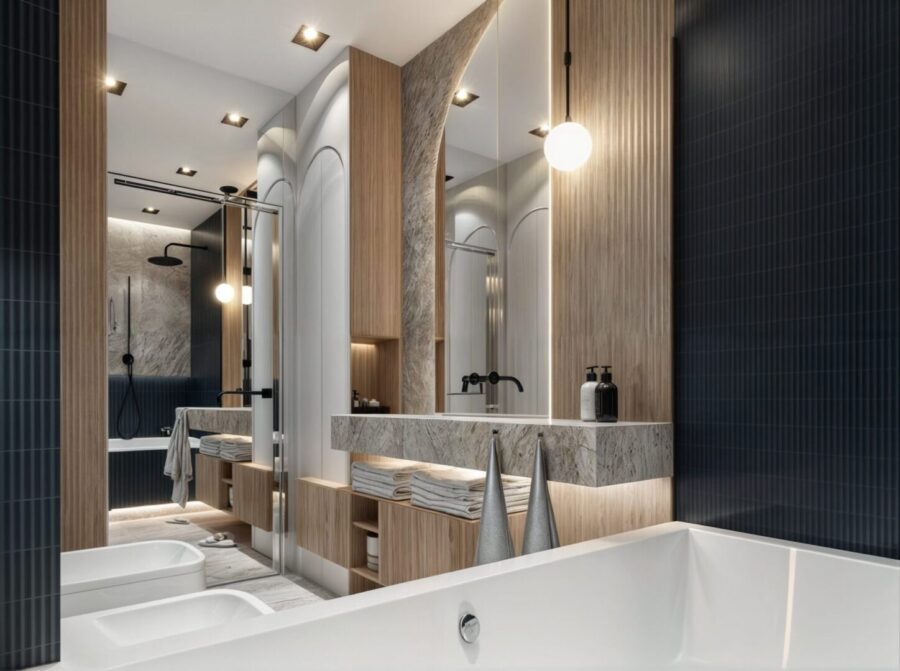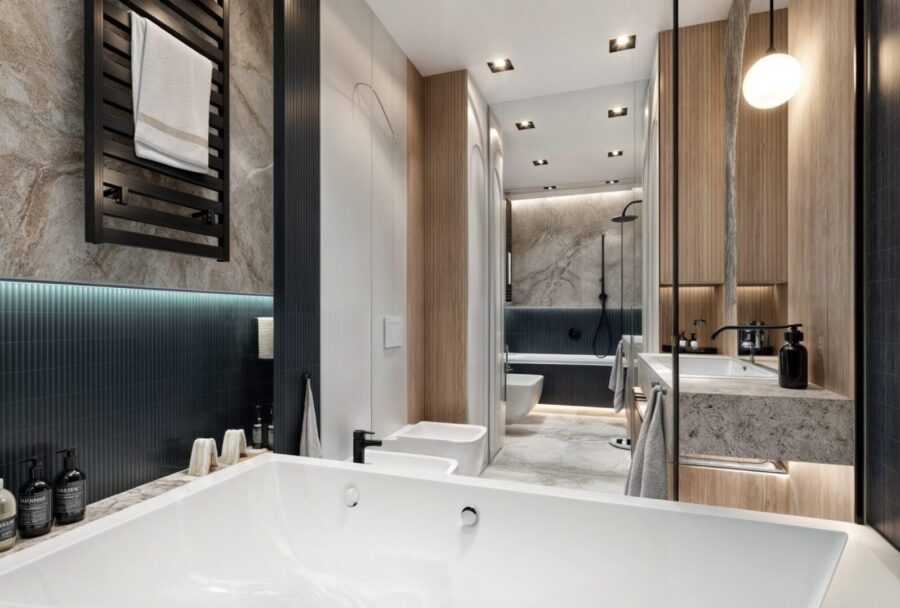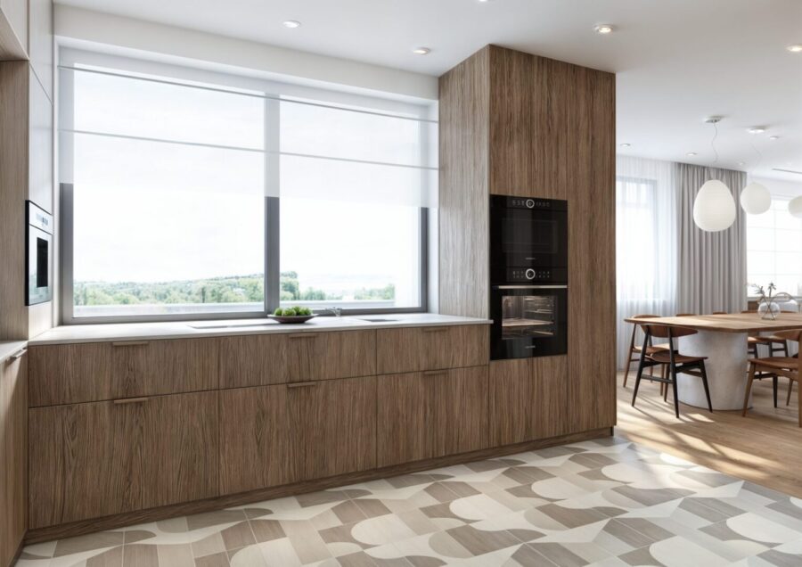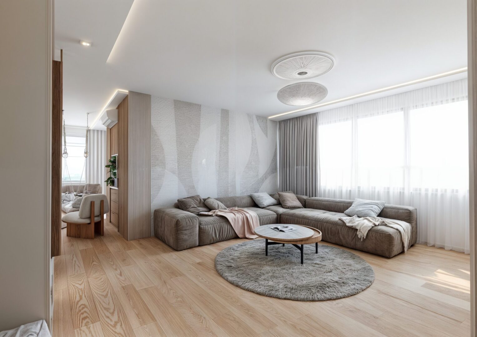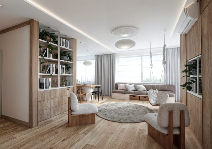 Projekt wnętrza apartamentu na ostatniej kondygnacji o podwyższonym standardzie. Sześcio-pokojowy apartament z kuchnią otwartą na część dzienną, zaprojektowany został w jasnej, beżowo – białej kolorystyce z elementami drewnianymi w nurcie japandi. Harmonijną i przytulną przestrzeń dopełnia oświetlenie.