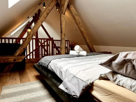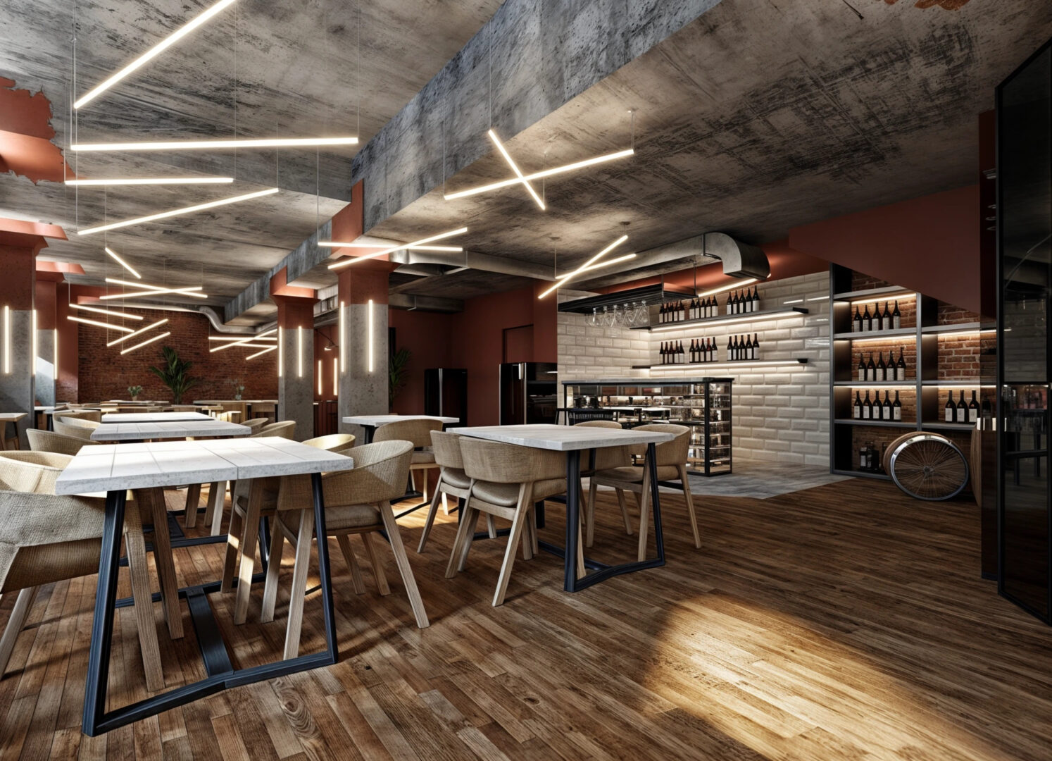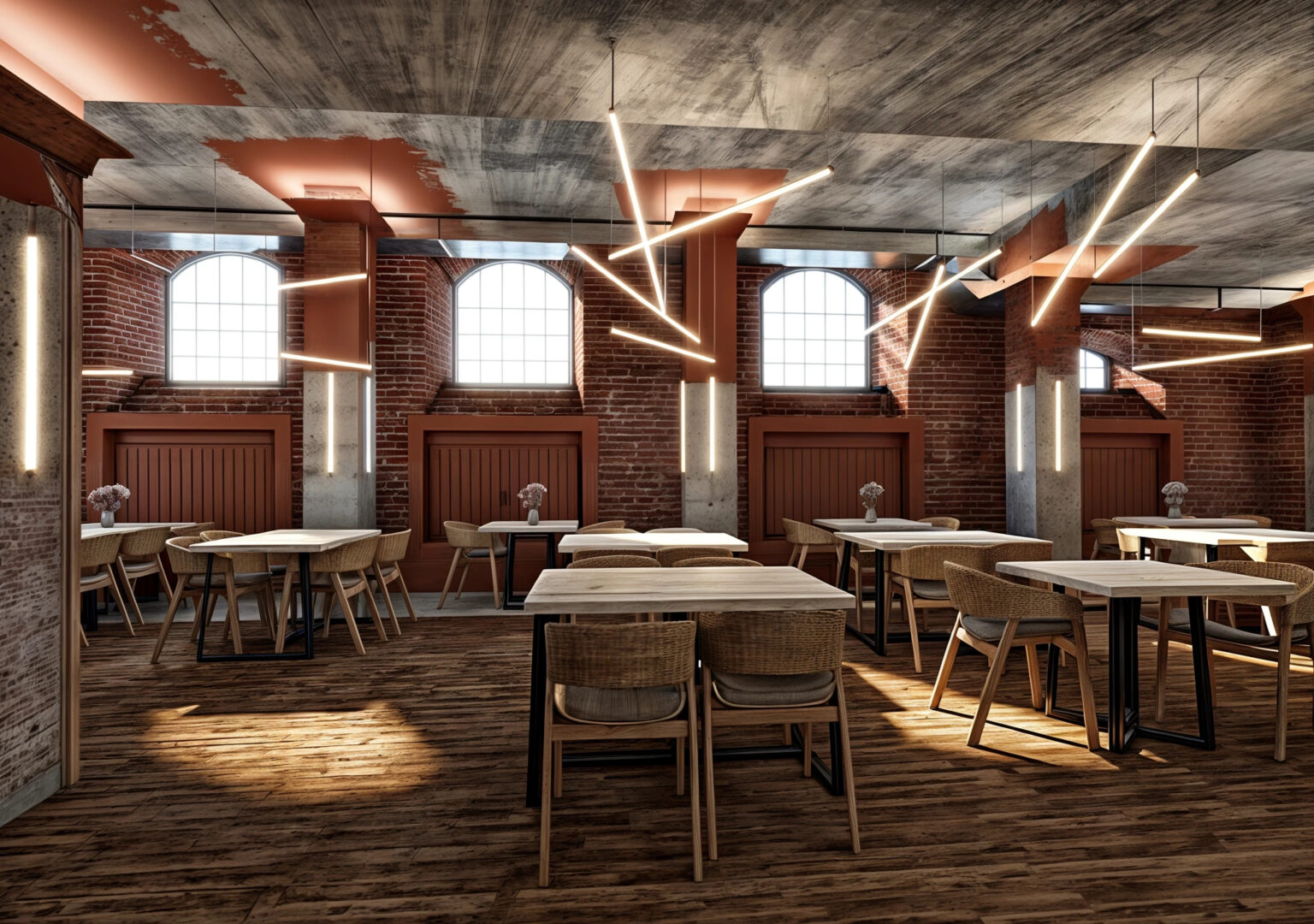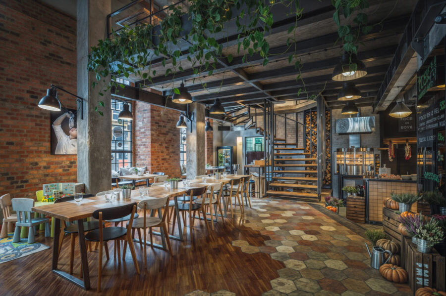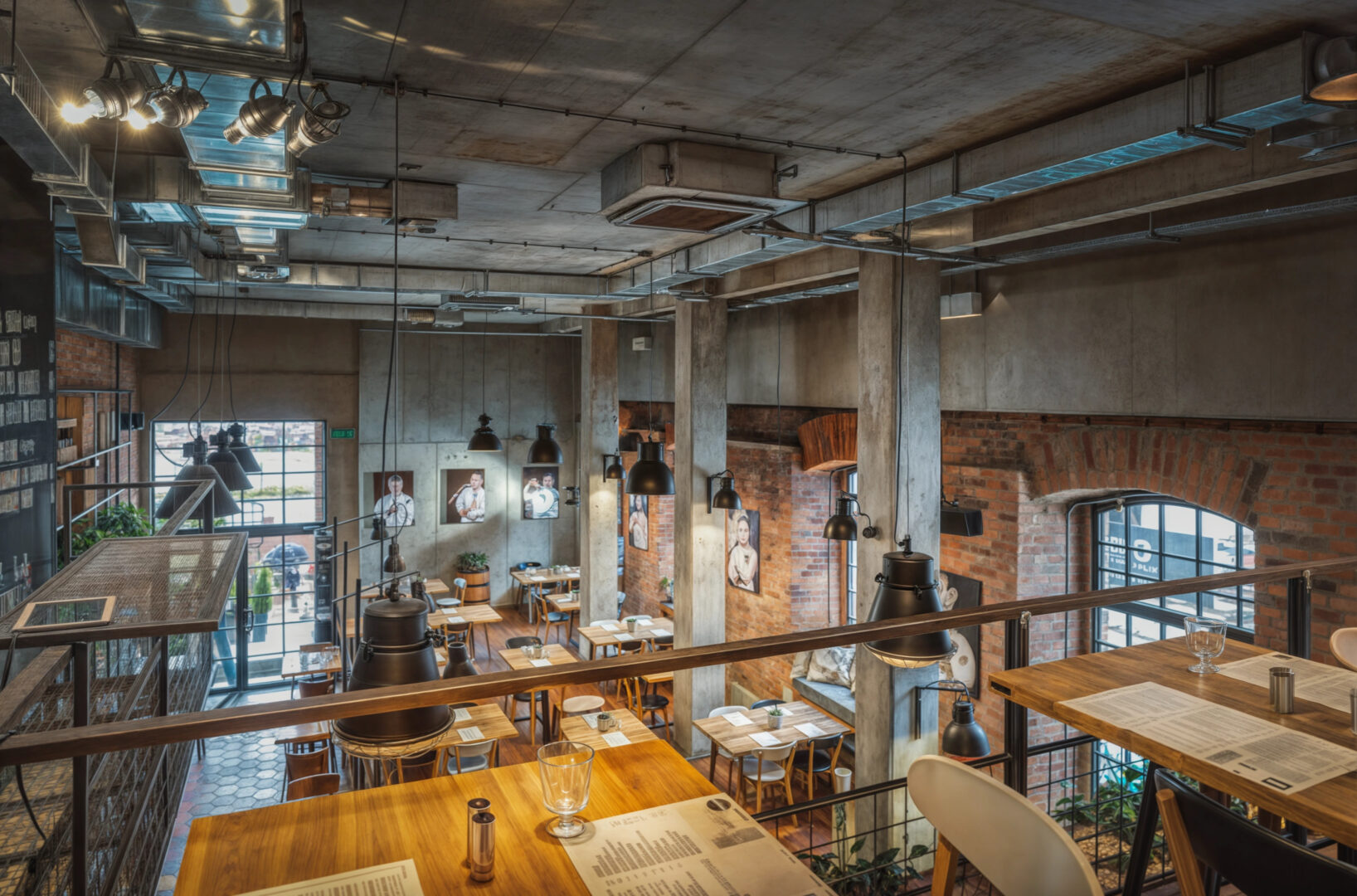 Restauracja ma aż 3 poziomy dostępne dla gości, zaczynając od sutereny przewidzianej na przyjmowanie zamkniętych wydarzeń towarzyskich, przez ogólnodostępny parter po antresolę przystosowaną do spotkań biznesowych. Wielkość lokalu zapewniła miejsce dla zaproponowania atrakcji w postaci otwartej kuchni na potrzeby przygotowywania pizzy, strefy baru oraz przestrzeni dla gości. Z szacunku dla tektoniki budynku, i jego elementów zabytkowych staraliśmy się nie konkurować wystrojem, odsłaniając naturalne materiały konstrukcyjne w postaci cegły i betonu.