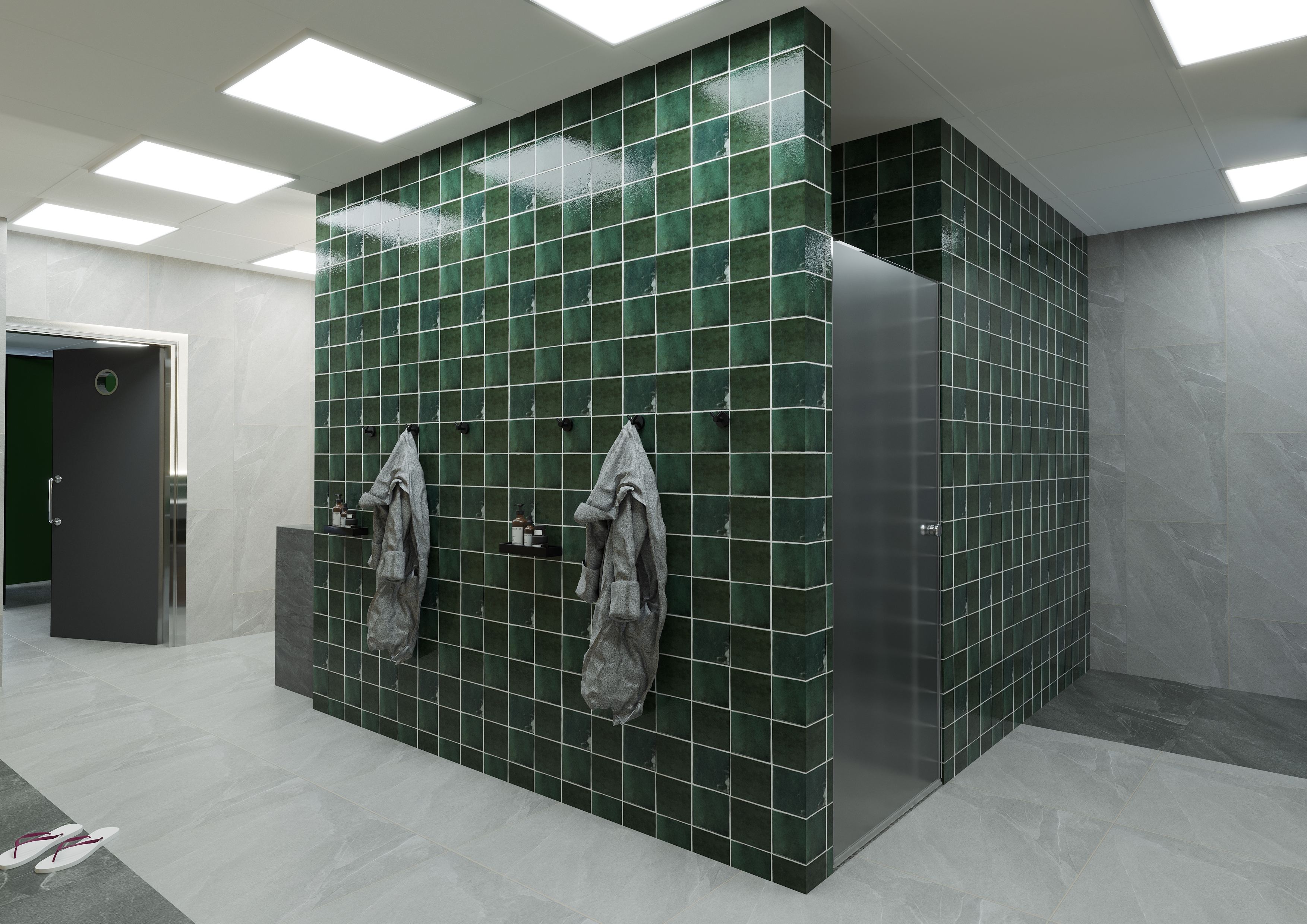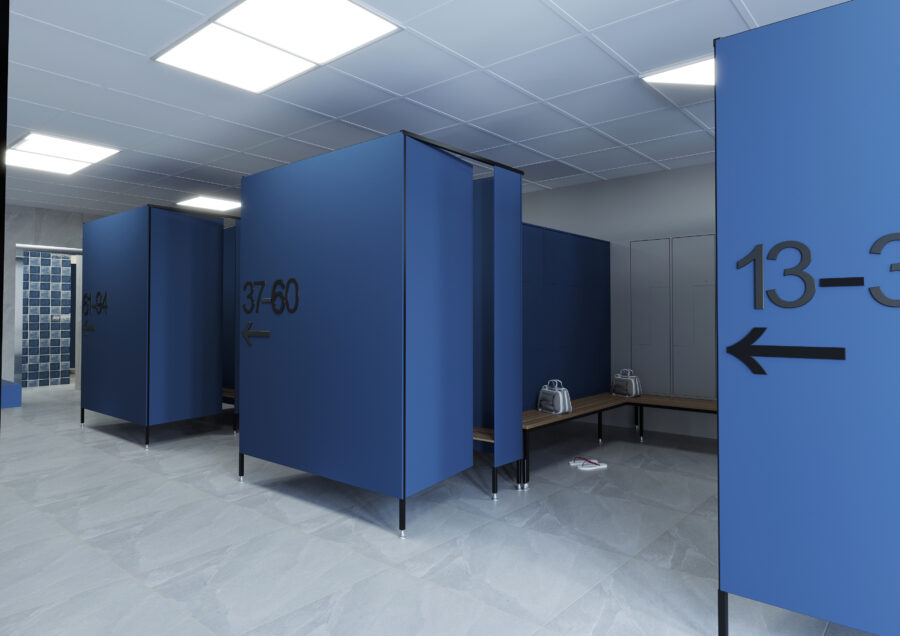 W strefie przebieralni zastosowano model kabin przechodnich z ławkami. W każdej ze stref w linii szafek umieszczono ławki z materiałów drewnopodobnych. Drzwi kabin prysznicowych wykonane zostały ze szkła dymionego, dzięki czemu są one nietransparentne.